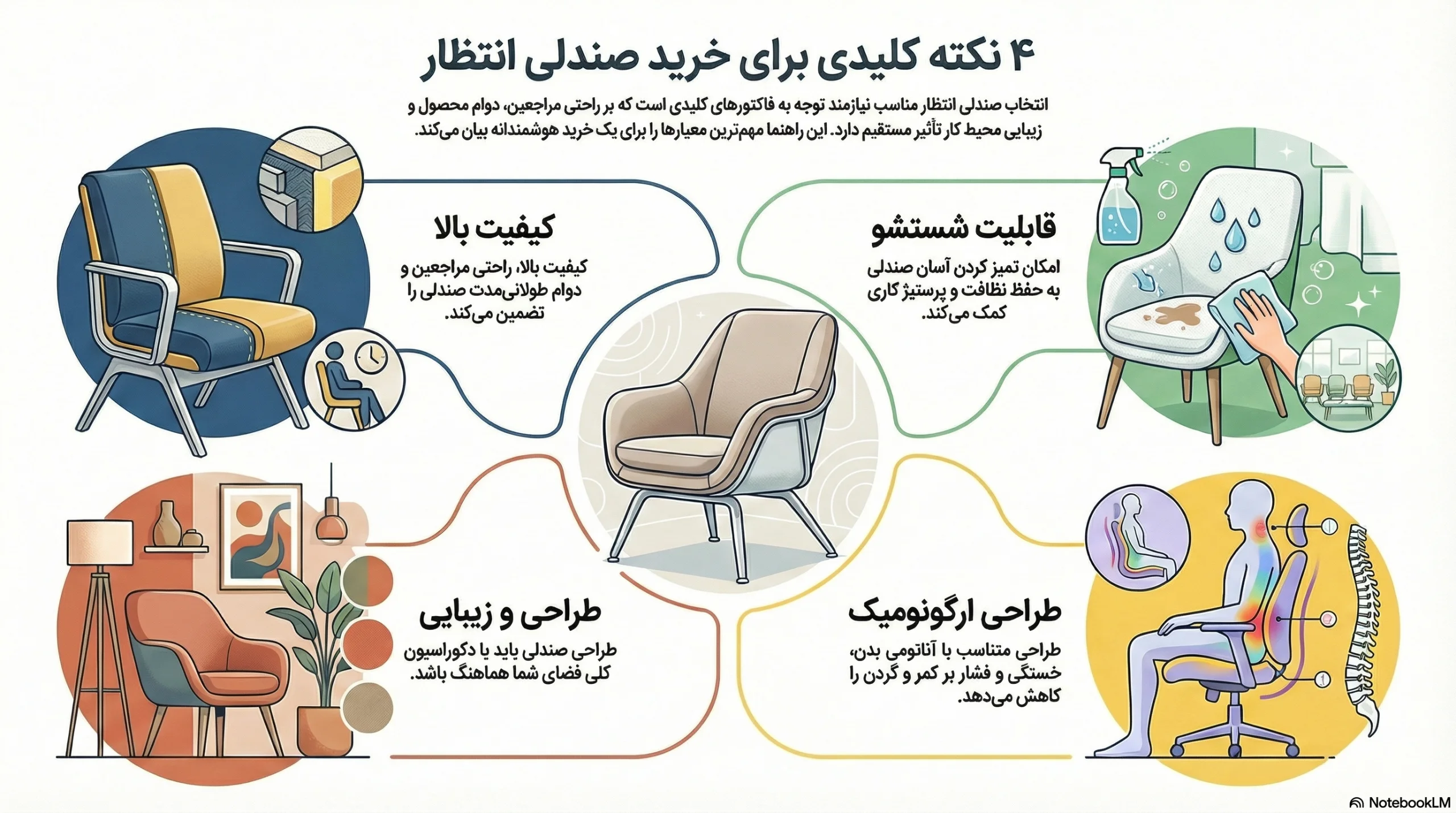 در صورتی که میخواهید برای خرید صندلیهای انتظار اقدام کنید، باید به برخی از فاکتورها توجه داشته باشید. این فاکتورها به شما کمک میکنند بهترین محصول را خریداری کنید و بتوانید از خرید خود رضایت داشته باشید. این فاکتورها به شرح زیر هستند: